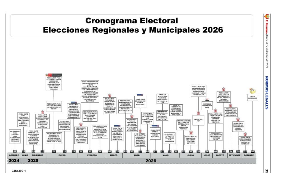 De acuerdo con la línea de tiempo, el 16 de febrero es el plazo máximo para que partidos y movimientos comuniquen a la Oficina Nacional de Procesos Electorales (ONPE) la modalidad de sus primarias. También indica que el 7 de abril es el último día para el cierre del padrón electoral, a cargo del Registro Nacional de Identificación y Estado Civil (Reniec).